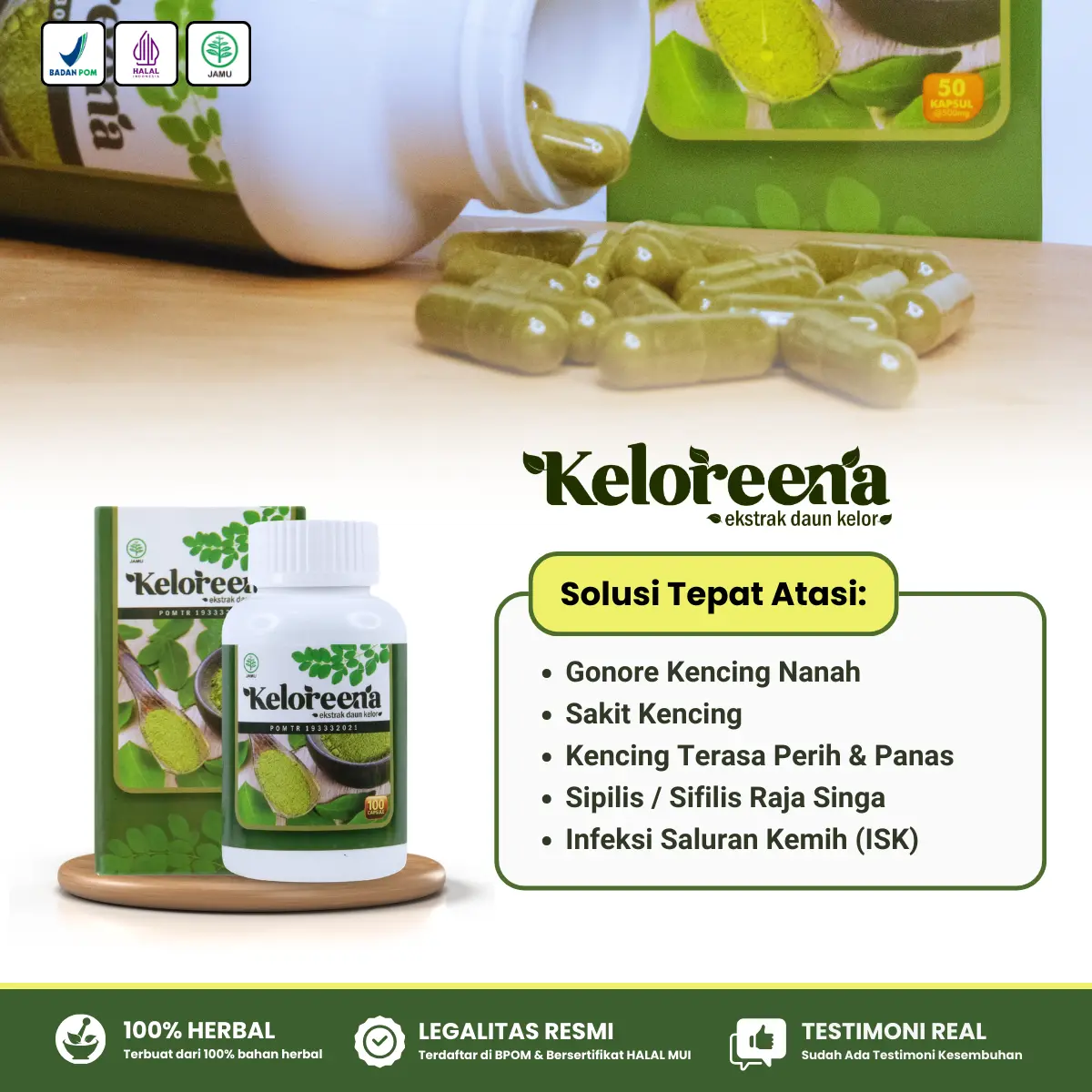 Keloreena adalah suplemen herbal berbahan dasar ekstrak daun kelor yang diformulasikan untuk membantu menjaga kesehatan tubuh secara menyeluruh, khususnya bagi pria yang ingin tetap aktif dan percaya diri.