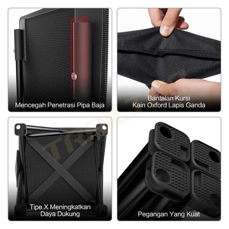 Memiliki Rangka Yang Kuat Mampu Menahan Beban Hingga 120 Kg-Kaki Anti Selip Dan Anti Aus/Braket Bawah Plastik Yang Dipertebal, Tahan Lama & Anti Aus.Mudah Dilipat Dan Disimpan , Tidak Perlu Bongkar Pasang/Penvimpanan Bebas/Tidak Memakan TempatBagian Bawah Bantalan Terdapat Tali Yang Diikat Silang/Nvaman Duduk Lama. Anti Melorot. Stabil.Karet Cincin Pelindung Dipertebal/ Melindungi Dari Kerusakan,Menambah Daya Tahan PakaiSudut Bantalan Diperkuat/ Meringankan Tekanan Kursi, Lebih Kuat