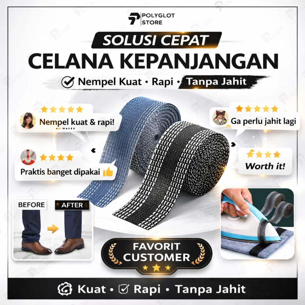 LEM JEANS 1M PEMENDEK CELANA JEANS TANPA JAHIT UKURAN 100CM Katun. Tanpa jahit β tinggal tempel & setrika. Kuat menempel di jeans, katun, kain tebal. Hemat waktu & biaya ke tukang jahit. Panjang 1 meter β bisa untuk beberapa celana. Cocok untuk celana jeans, chino, kain kerja, rok, seragam.