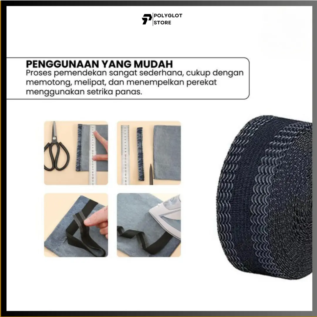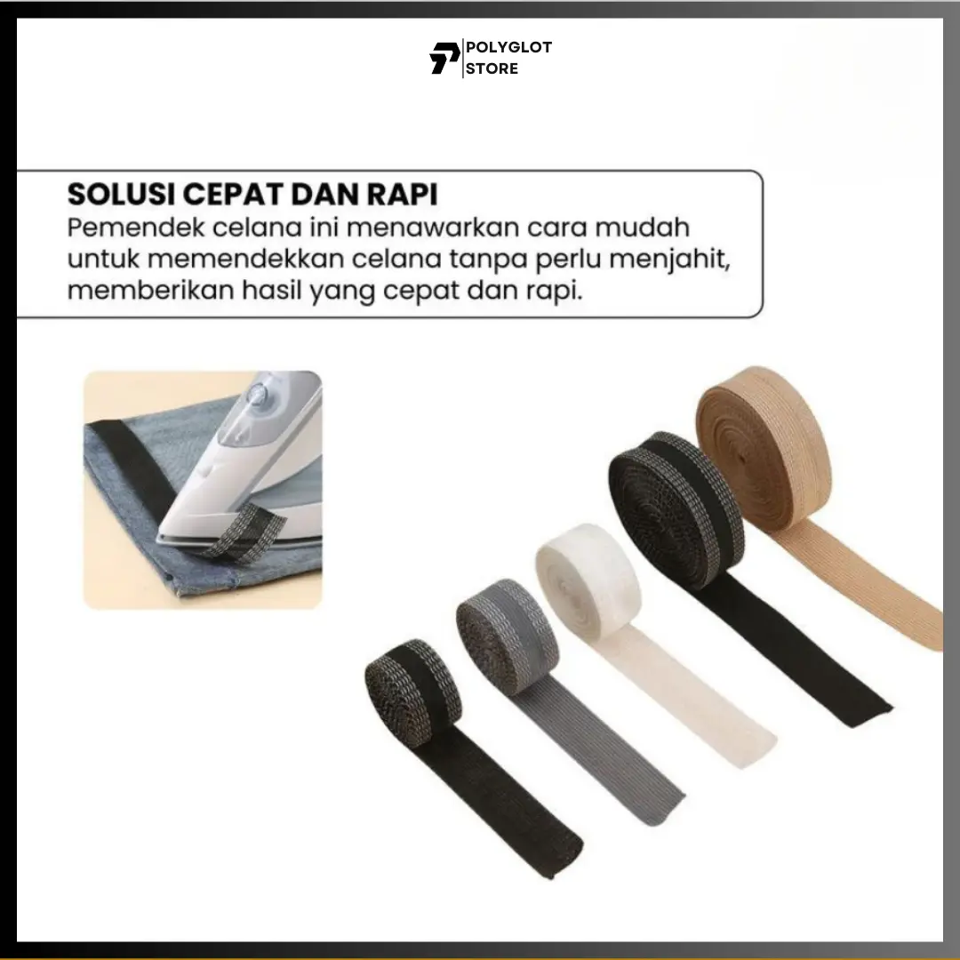 Material: Poliester. Lebar: 2.5 cm. Panjang: 1 M. Kecocokan Bahan Celana: Denim, Poliester, dan Katun. Rincian yang Anda dapatkan untuk pembelian produk ini: 1 x TaffHOME Pemendek Celana Self Adhesive Pants Shorten Paste Iron 1M - L-103.