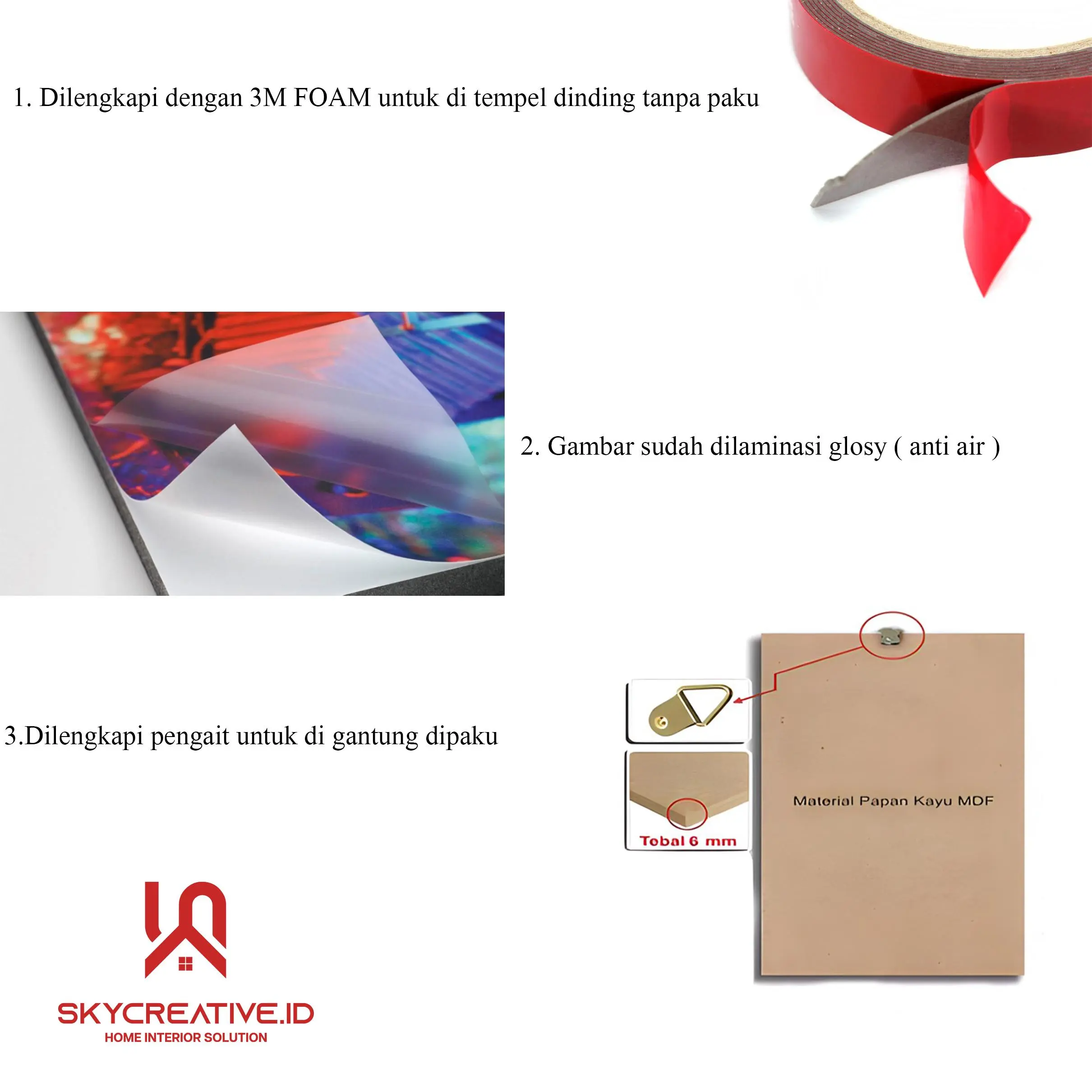 Sudah ada pengait, tinggal pajang di dinding.