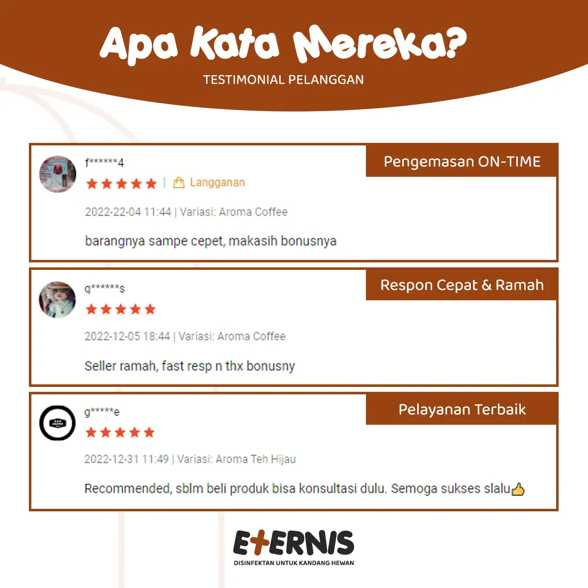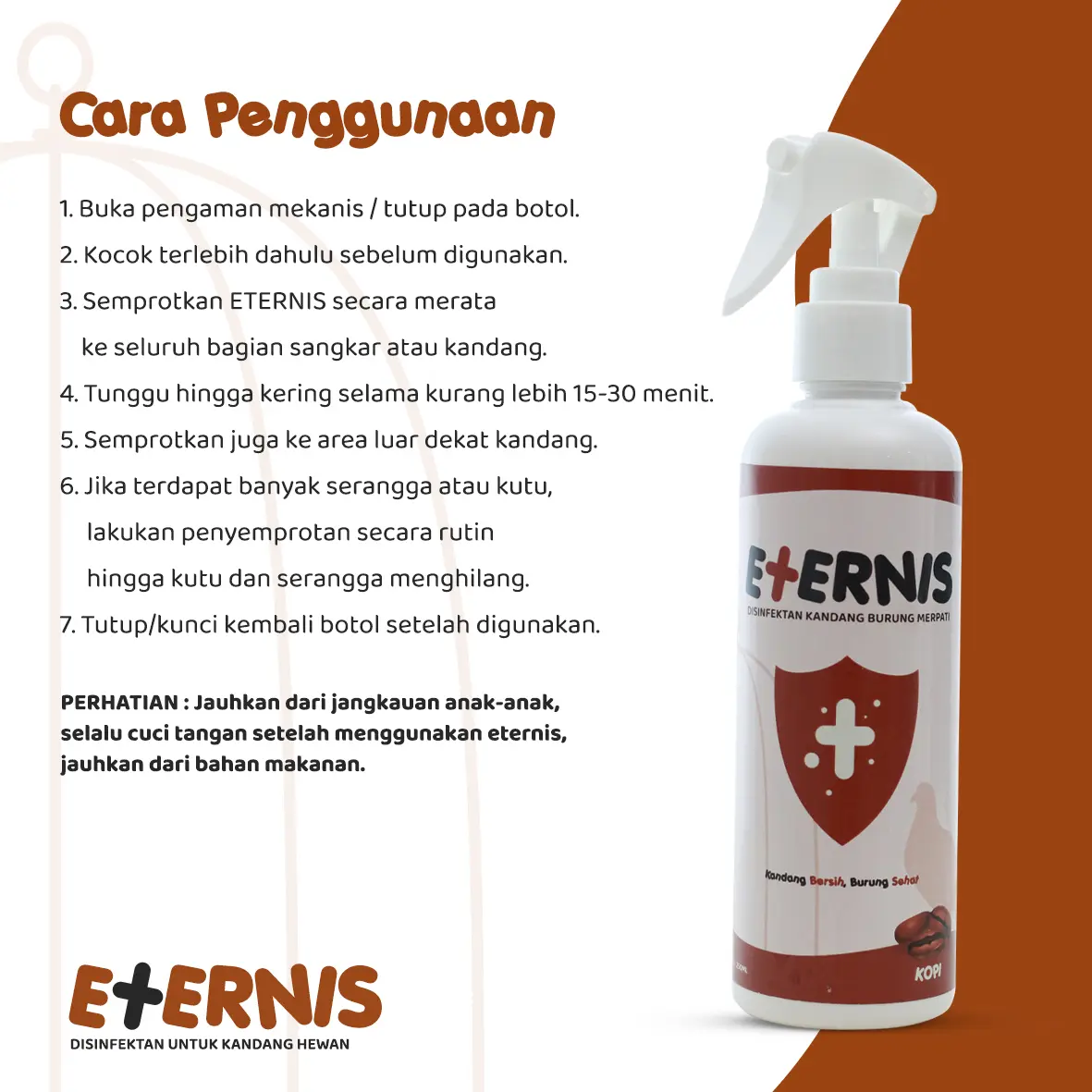 ETERNIS adalah Spray Penghilang Bau No.1 Di Indonesia dan pertama Khusus untuk merpati , dapat menghilangkan bau apapun dengan cepat tanpa meninggalkan noda. Eternis menggunakan bahan yang aman bagi hewan peliharaan , dapat membunuh semua mikroorganisme berbahaya seperti : - Virus - Kuman - Bakteri KEUNGGULAN ETERNIS : 1.Terbukti menghilangkan bau seketika tanpa meninggalkan noda . 2.Melindungi kandang hewan peliharaan dari kuman , bakteri , dan virus . 3.Dapat mengusir lalat di area kandang peliharaan . 4.Membunuh 99,99% mikrooganisme berbahaya (kuman bakteti dan virus) . 5.100% produk natural alami , aman dan ramah lingkungan TERSEDIA VARIAN WANGI (AROMA) : 1. Jagung 2. Kopi 3. Green tea -- ETERNIS SPRAY PENGHILANGAN BAU KANDANG MERPATI ---- MENGHILANGKAN BAU SEKETIKA ------
