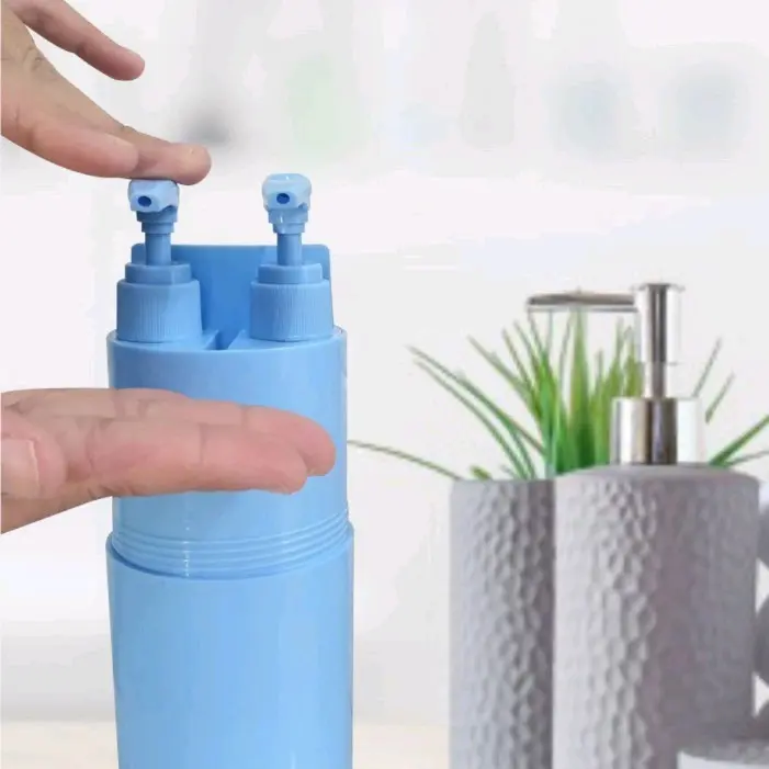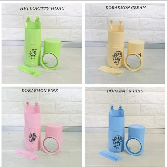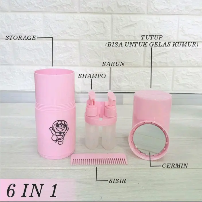 Set Travel Toiletries Kit Cute 2 Motif Lucu Wadah Perlengkapan Alat Mandi Travel serbaguna hemat tempat Deskripsi Produk Item yang wajib Anda miliki ini memiliki banyak sekali fungsi yang dapat menghemat ruang pada koper/tas travel Anda pada saat berpergian. Dengan membawa botol perlengkapan mandi ini Anda akan menemukan semua kebutuhan utama pada saat mandi. Tempat Shampoo & Sabun Botol ini memiliki dua kontainer dengan dua buah pencetan yang dapat Anda isi dengan sabun cair dan juga shampoo dengan kapasitas kurang lebih 60ml, pencetan ini juga dilengkapi dengan jepitan sehingga mencegah tertekan secara tidak sengaja. Gelas Kumur Penutup botol dapat Anda jadikan gelas kumur ketika di buka, ataupun tempat meletakkan odol dan sikat gigi. Sisir Anda juga mendapatkan sebuah sisir dalam kemasan, sisir dapat diletakkan pada selipan di dalam botol, sehingga memudahkan Anda untuk menggunakan dan menyimpannya. Holder Pasta Gigi Dibalik tempat sabun dan shampoo terdapat ruang untuk Anda menyimpan odol dan sikat gigi dengan ukuran sedang. Cermin Anda dapat menemukan sebuah cermin mini berbentuk bundar pada bagian bawah botol apabila dibuka, sehingga Anda dapat merapikan riasan wajah Anda menggunakan cermin ini sehabis mandi. Ruang Handuk Mini Apabila tutup botol pada bagian bawah dibuka, selain menemukan cermin Anda juga dapat melihat satu ruang yang cukup untuk menyimpan satu buah handuk wajah. Barang-barang yang Anda dapat dalam kotak produk: 1 x Travel Toiletries Kit 1 x Sisir 1 x Cermin